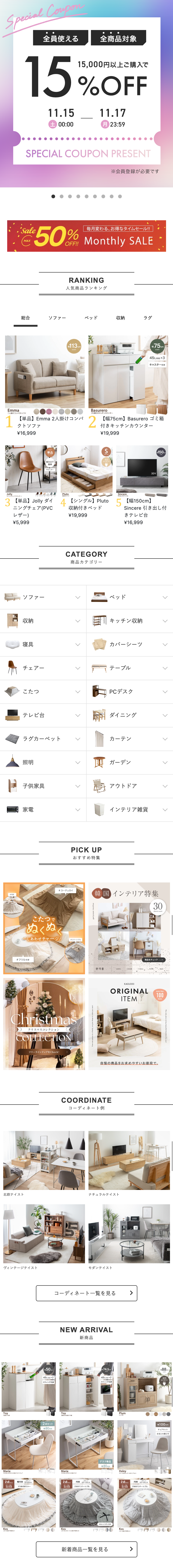 家具350では、1回の注文で10万円以上購入すると、5,000円OFFになる「まとめ買いクーポン」を発行してくれます。一人暮らしで家具を買うなら、ベッドや寝具一式、テーブル、イス、収納などで軽く10万円は越えてしまうかもしれません。「カフェやレストランをオープンする」「モデルルーム用の家具をそろえたい」と考えている方もトータルで10万円以上の買い物をするでしょう。