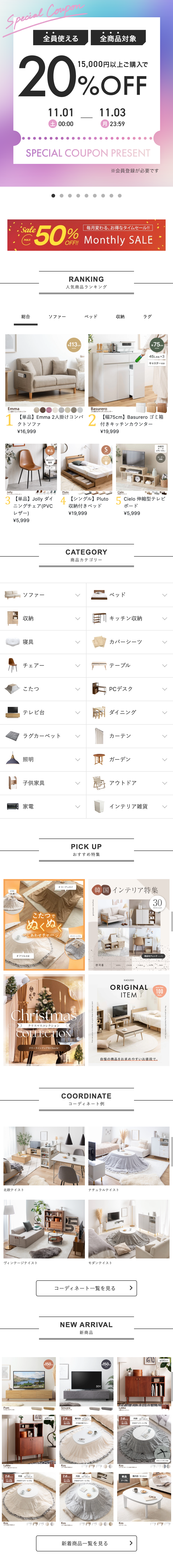 家具350では、1回の注文で10万円以上購入すると、5,000円OFFになる「まとめ買いクーポン」を発行してくれます。一人暮らしで家具を買うなら、ベッドや寝具一式、テーブル、イス、収納などで軽く10万円は越えてしまうかもしれません。「カフェやレストランをオープンする」「モデルルーム用の家具をそろえたい」と考えている方もトータルで10万円以上の買い物をするでしょう。